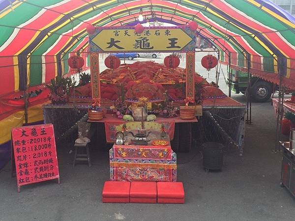 去年求得大龜王的信徒歐陽志旻今年加碼三百台斤白米,大龜王米包重一萬七千三百台斤,鳳片糕一千五百八十八台斤,已達一萬八千八百八十八台斤,另有金牌二兩八錢、金龜兩錢及五萬八千八百元紅包,相當壯觀,廟內另有多座信徒還願的米龜,製作頗為精緻,許多年幼信眾都說「好可愛」。