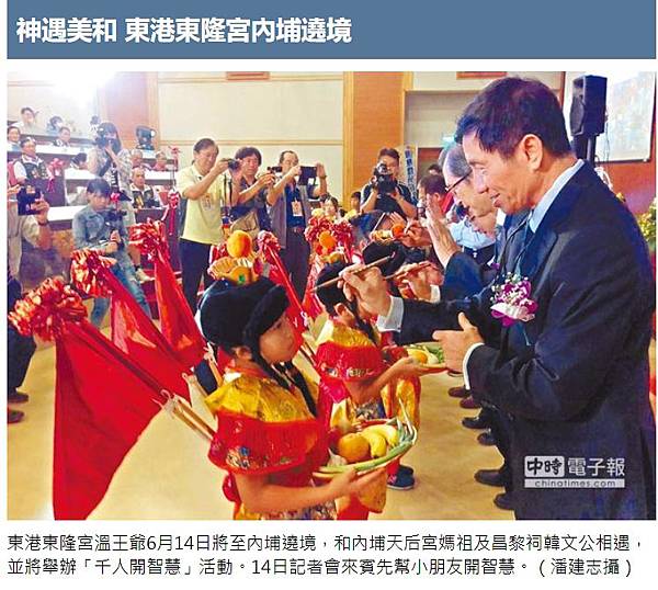 東隆宮今年正值三年一科的東港迎王平安祭,為了深化地方宗教文化,美和科大邀請東隆宮溫王爺到內埔和在地的六堆媽祖與韓文公相遇,沒想到60年未嘗到外地出巡的溫王爺竟然3聖筊同意,讓廟方人員也非常驚訝。