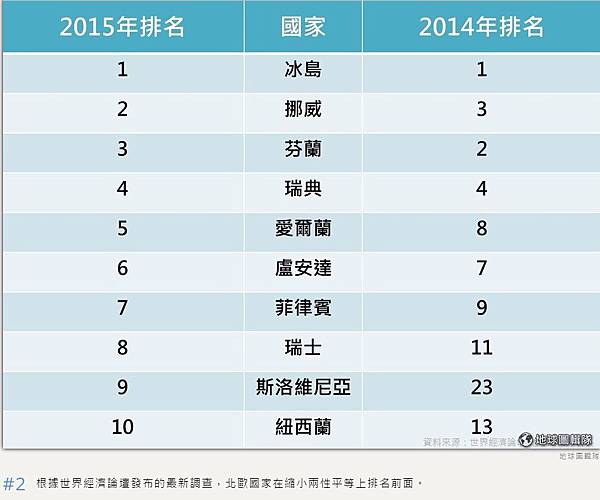 整體來說,發達國家如美國表現得較好,較差的國家則如墨西哥。然而,日本男尊女卑的問題相當嚴重,導致男女之間差距的相當大;近來安倍經濟學中,就有著墨這點,希望女性不要全天在家照顧小孩,而是出門掙薪水以提振國家經濟表現。