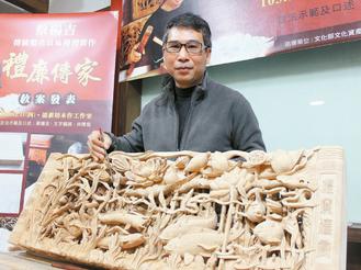 從事傳統木作45年的新竹市木雕藝術家蔡楊吉,有感傳統技術面臨凋落,透過「傳統鑿花技術傳習教案編撰」計畫,歷時8個月完成水族圓光「禮廉傳家」木雕作品,盼透過技術保存,傳承文化資產。