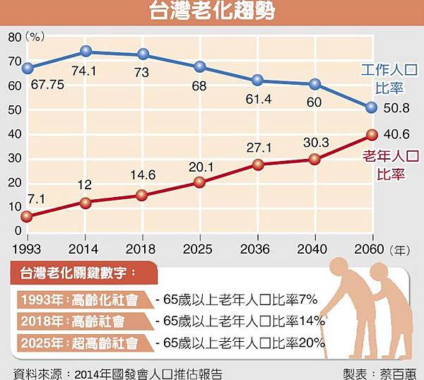 編按: 台灣老得好快,2025年將邁向老人超過20%的超高齡社會,屆時走在路上,迎面而來5人之中就有1個是老人,到了2060年,台灣勞動人口更將只剩一半。銀髮海嘯的威脅迫在眉睫,本報調查採訪室即日起一連4天推出「明日城市 - 活力不老」系列報導,探討都市化社會的孤獨死、勞動力萎縮和長照資源不足等現象,凸顯政府未及早規畫因應老化社會的後果;同時援引日本運用高齡人力和發展老人住宅的經驗,期許台灣能為人口老化做好準備,讓明日城市維持活力不老。 (策畫:張瑞昌、謝錦芳、蔡百蕙)