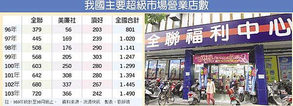 近年來超級市場走入社區,據《流通快訊》統計,截至今年10月底止,全台超市店數1,490家,較去年底增加45家,其中,全聯720家為國內最大連鎖超市,其次為美廉社366家,而頂好超市242家,居第三位。