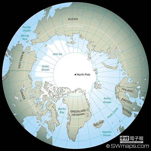 北極地區情勢圖,圖中央下方的大島為格陵蘭。(翻攝自網路)