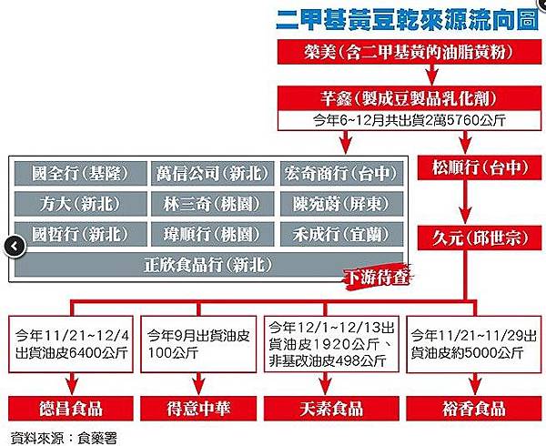 經台南市衛生局的追查,芊鑫今年六月至十二月間共計出貨兩萬五千多公斤乳化劑,分別銷往新北市「萬信」、「正欣」、「國哲」、「方大」;宜蘭「禾成行」;桃園「林三奇」、「瑋順行」;台中「宏奇」及「松順」;基隆「國全行」及屏東「陳宛蔚」等十一家廠商,由於芊鑫已營運十多年,配方是否都含二甲基黃?有待查證;而松順把乳化劑賣給久元企業社製成油皮賣給「德昌」、「得意中華」、「天一」及「裕香」等四家業者。