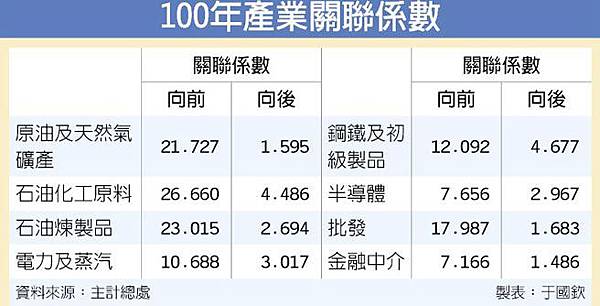 石油的下游石化原料,其向前關聯係數也高達26.660、石油煉製品也有23.015,說明我國生產體系對原油、石化原料需求極高,當油價一漲,百業成本皆升,而當油價一跌,自然百業皆受惠,如此一來經濟成長自然會提升。