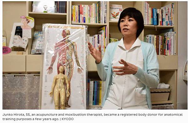 現年 55 歲的廣田純子(Junko Hirota)是針灸治療師,於數年前登記將來要捐贈自己的遺體。當她 30 多歲在東京醫科齒科大學(Tokyo Medical and Dental University)接受針灸訓練時,曾親身體驗從大體解剖可學到許多關於人體的知識,這讓她以後生活時思考自己的身體也可以成為其他人的「教科書」。
