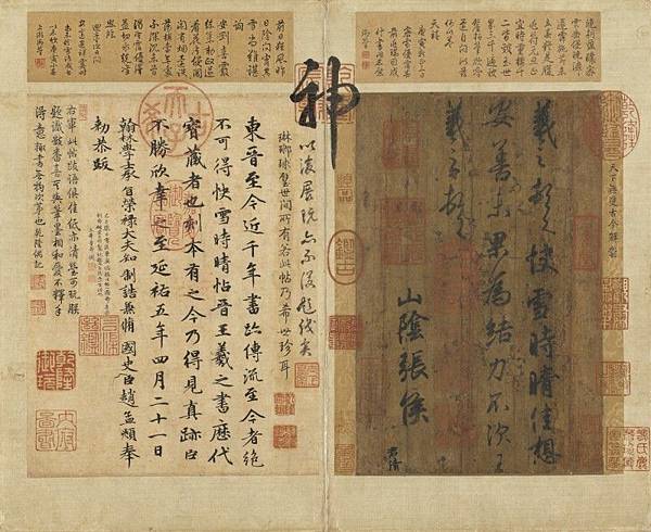 我相信大家對三希之寶都很熟悉, 乾隆皇帝從無數的內府收藏中選出,王羲之〈快雪時晴帖〉, 其子王獻之〈中秋帖〉, 以及姪子王珣〈伯遠帖〉三件希世之寶。〈快雪時晴〉是一對短信 ,前後有非常多附加的副葉 ,在前副葉上乾隆皇帝題了「神乎技矣」 ,對王羲之的書法藝術佩服的五體投地 ,他為「三希之寶」蓋了一間「三希堂 」,甚至令人編了《三希堂法帖》, 匯集乾隆皇帝的書法收藏 ,帖中有宋高宗「紹」、「興」連珠收藏印 。副葉還有金章宗的一方收藏印 ,另外還有南宋權相賈似道「秋壑珍玩」的收藏印。 此外副葉當中最早的題跋是元代皇帝命令趙孟頫於元祐五年所題的書跋, 趙氏書法也深受王羲之的啟發。 還有元、明、清歷代的題跋, 乾隆皇帝不只收藏, 他有空就拿出來臨仿 ,次數不下百次, 最後合王獻之〈中秋帖〉, 以及王珣〈伯遠帖〉為「三希」 。