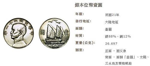 1933年3月8日,國民政府公佈《銀本位幣鑄造條例》規定,銀本位幣定名為“元”,總重量為26.6971克,銀八八、銅一二,即含純銀23.493448克。銀本位幣每元重量及成色,與法定重量、成色相比之下公差不得超大型過0.3%,並規定一切公私交易用銀本位幣授受,其用數每次均無限制。同年4月,國民政府實行“廢兩改元”,發行全國統一的銀幣——“孫中山頭像”銀元。1935年國民政府義實行所謂幣制改革,宣布廢止銀本位。