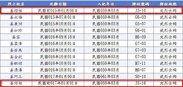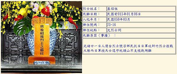 再者,臺灣光復後,政府嘉許姜紹祖抗日的義舉。因此,祀其牌位於臺北市圓山忠烈祠,永享國家春秋祭拜的殊榮。