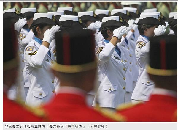 至於為何印尼要求女兵是處女,《BBC中文網》2015年曾報導,當時的印尼武裝部隊發言人表示,如果沒有處女限制,那有「惡習」的人就會成為軍人,而且女生在婚前就喪失貞操,那她的精神態度也不適合從軍。女兵入伍前被迫接受「貞操檢查」 印尼軍方將終結陋習 - 國際 - 自由時報電子報 https://bit.ly/3CnGyEJ
