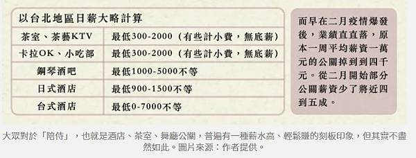 大眾對於「陪侍」,也就是酒店、茶室、舞廳公關,普遍有一種薪水高、輕鬆賺的刻板印象,但其實不盡然如此。雖然各種形式的店家計薪方式都不一樣,有高有低,但許多陪侍公關的薪資是以「業績制」計算的,通常沒有一定底薪,被客人選中才會開始計薪,從一日淨賺500元到一天淨賺7,000元以上都有可能。換句話說,如果當天完全沒有生意,則整天上班就形同做白工了!