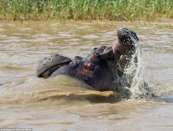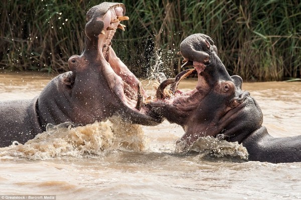 成年河馬大打出手,場面相當驚人。(圖擷取《每日郵報》)