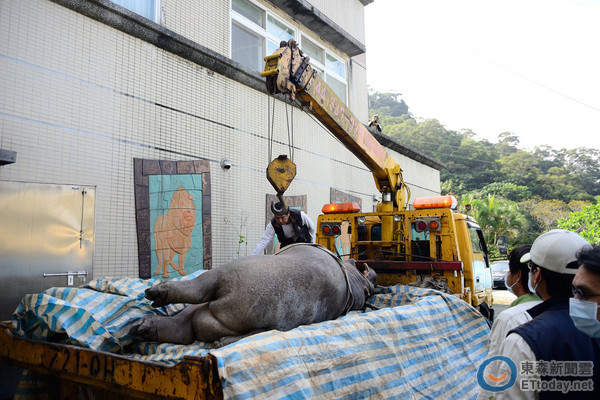 日前運送過程中兩度摔落地面受傷的河馬「阿河」昨天猝死,遺體從水池中被吊起。(記者張軒哲攝)