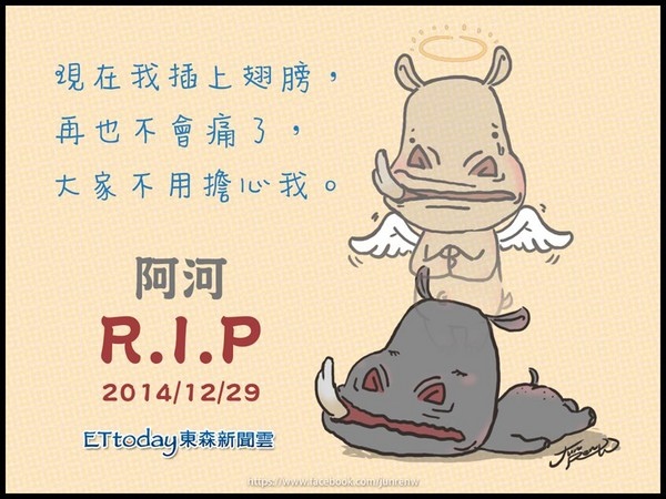 先前傳出跌落重傷的河馬阿河,在受到暫時安置後,原以為可慢慢復原,當時天馬牧場獸醫陳偉立還表示,未來的3到7天,是阿河的重要觀察期,每天都會觀察牠的進食、排便情形,怎料突於今晨死亡,遺體將送解剖查明死因。28日下午時,阿河的專屬照護員阿忠,還曾帶著蘋果、蔬菜、特製乾草前來探望,但由於當時池塘邊聚集許多爭睹阿河的民眾,所以阿忠費了一番功夫才把阿河呼喚到岸邊。而新任台中市長林佳龍,先前也在臉書PO上阿河游泳的影片,3小時就吸引40萬人瀏覽,表示「台中阿河已進食,如再排便,就更好了」,阿河萌樣,儼然已擄獲全台人心。阿河由天馬牧場所飼養,號稱是可以近距離互動的河馬,年紀約30多歲,因為性情溫馴,還曾與林依晨拍攝偶像劇,約在6、7年前開放民眾參觀,大受歡迎,是牧場的明星動物。如今牠走了,張大嘴撒嬌的模樣,只能永留回憶中了。