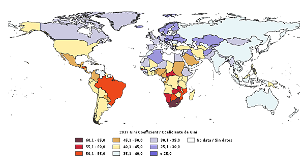 目前全球堅尼系數最高的地方是非洲的納米比亞,亞洲地區中國的吉尼係數超過0.4。但根據北京大學社會科學院的報告,2012年中國家庭凈財產的堅尼系數達到0.73,頂端1%的家庭佔有全國1/3以上的財產。[6]美國堅尼系數達0.42。[3]2001年以後香港達到0.525,2006年高達0.533,2012年更高達0.537[7],香港成為已發達國家中貧富懸殊最嚴重的地區;即使把開發中國家包括在內,香港和新加坡的貧富懸殊也十分嚴重,僅次於薩爾瓦多、哥倫比亞、智利、瓜地馬拉、巴西、南非以及一系列非洲國家而排名倒數18位[2],台灣2010年官方的堅尼系數為0.342[8]2013年學者計算為0.36[3];日本、南韓、歐洲等前沿民主國家的指數亦均低於0.4。