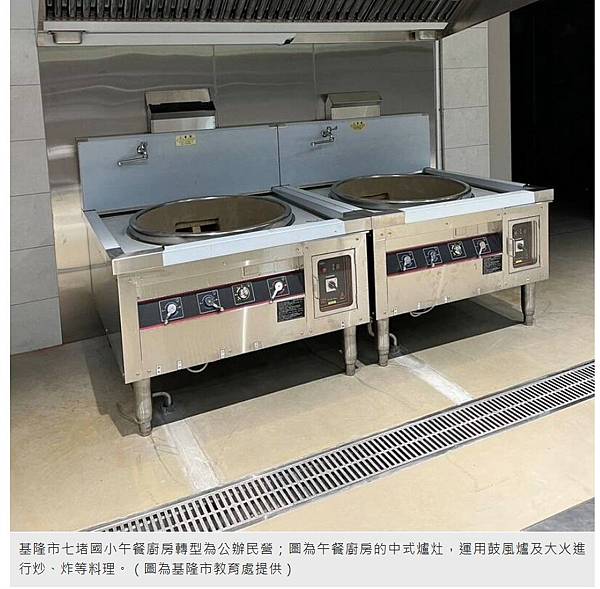 基隆市七堵國小午餐廚房轉型為公辦民營;圖為午餐廚房的中式爐灶,運用鼓風爐及大火進行炒、炸等料理。(圖為基隆市教育處提供)