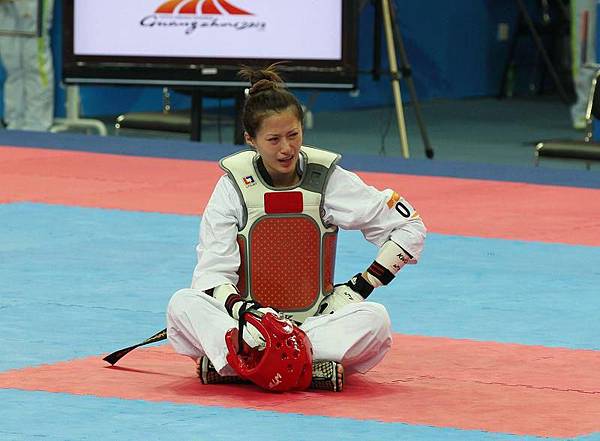中華跆拳道選手楊淑君2010年在廣州亞運女子49公斤級賽,被審判委員以器材不合格取消資格,楊淑君當時已取得9比0領先,她心有不甘,坐在地上痛哭,不肯離去。(中央社檔案照片)