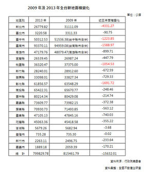 而農田違規使用已是全國性的問題,觀察農委會統計資料可發現,截至2013年年底,耕地面積為799,829.78公頃(約2,419,482,725坪),而2009年時,耕地面積815,461.79公頃(約2,466,769,525坪),換言之,5年來台灣農地已消失15632.01公頃(約47,286,800坪),平均每年減少3,126公頃(約9,075坪)。