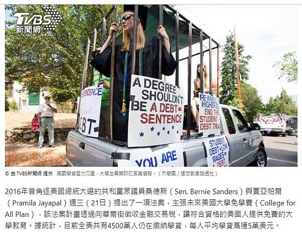 2016年曾角逐美國總統大選的共和黨眾議員桑德斯(Sen. Bernie Sanders)與賈亞帕爾(Pramila Jayapal)週三(21日)提出了一項法案,主張未來美國大學免學費(College for All Plan),該法案計畫透過向華爾街徵收金融交易稅,讓符合資格的美國人提供免費的大學教育。據統計,目前全美共有4500萬人仍在繳納學貸,每人平均學貸高達5萬美元。全美4500萬人扛學貸 議員推「大學免學費」法案 https://bit.ly/32IMcRa