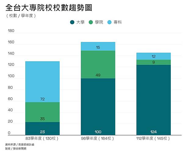 在喊出「廣設大學」口號的1994年,全台灣只有23間大學、35所學院,要考上大學確實是要「擠進窄門」。如今大專校院共計149所,其中大學126所、學院11所、專科12所,面臨「過剩」窘況。