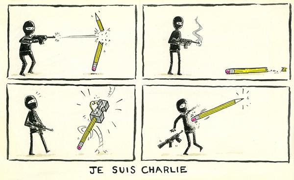 雜誌專欄作家Magnus Shaw,將史努比中的查理布朗低頭摀著臉、難過不已的圖片,配上法文「Je suis Charlie(我是查理)」的字樣,在Twitter寫下「對所有漫畫家來說,可怕的一天」;美國政治漫畫家Rob Tornoe,畫出多支尖銳的鉛筆、原子筆,矛頭全指向拿槍的蒙臉男子,象徵「筆的復仇」,他說「言論自由永遠是贏家」。