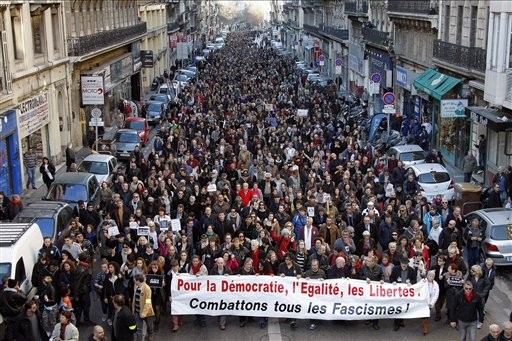巴黎大眾運輸工具今天免費,數條地鐵線、重要轉運站和靠近遊行起點共和國廣場的車站,都塞滿人群。除巴黎外,法國各地城市也有自發集會,總計全國有250萬人上街反恐。