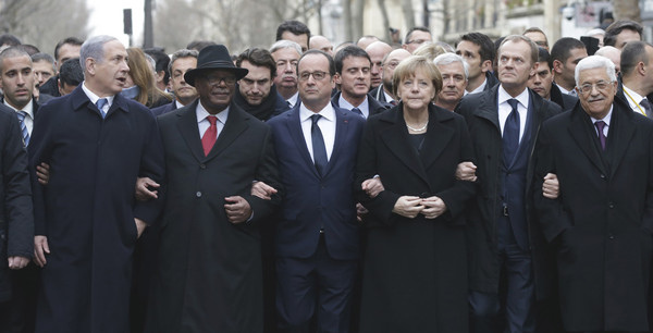 在總統歐蘭德陪同下,德國總理梅克爾(Angela Merkel)、英國首相卡麥隆(David Cameron)都到場參加;美國由司法部長霍德(Eric Holder)代表,俄國則是外交部長拉夫羅夫(Serguei Lavrov);以色列總理尼坦雅胡(Benyamin Netanyahou)及巴勒斯坦領袖阿巴斯(Mahmoud Abbas)相隔一段距離而走;阿拉伯及非洲國家元首也沒有缺席。總計有44位國家元首響應。