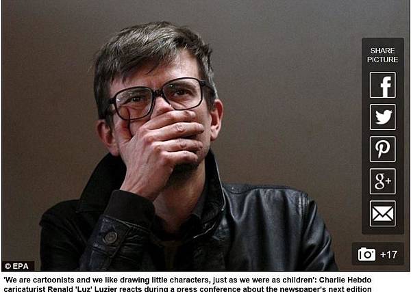 「每日郵報」(Daily Mail)報導,血案發生當天因為睡過頭而逃過死神的週刊漫畫家魯西爾(Renald 'Luz' Luzier)今天也現身記者會,痛哭失聲。iew image | 魯西爾繪製的特刊封面顯示,穆罕默德手舉「我是查理」標語,並流下一滴淚,頭頂橫披標題大字則寫著「寬恕一切」。