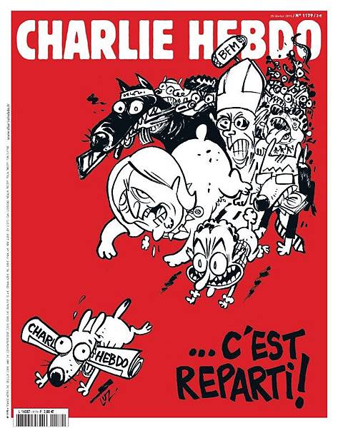 法國《解放報》(La Liberation)率先揭露《查理週刊》(Charlie Hebdo)最新一期封面,以紅色為底,一隻狗咬著捲起來的《查理週刊》在奔跑,後頭追著一群面帶憤恨的狗,有一隻帶著教宗帽,還有一隻狗咬著槍,意指聖戰士;其他還有兩隻看似極右派領袖瑪琳雷朋(Marine Le Pen)、前總統沙柯吉(Nicolas Sarkozy)等政治人物。