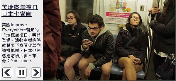 〔即時新聞/綜合報導〕「地鐵無褲日」(No Pants Subway Ride)熱潮蔓延至全球,今年活動在10日登場,有60國民眾參加,響應者只穿內褲搭車,在地鐵內成為另類風景。