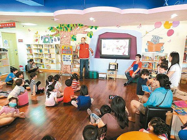 新社區圖書館也有英文說故事服務,加拿大籍老師Cindy挑選館中圖書,與316基督教會的台灣牧師胡恩光搭檔授課;每禮拜六上1小時,自願報名,迴響很熱烈,已有10多位小學生是固定「班底」,有時爸媽也一起來,互動溫馨。
