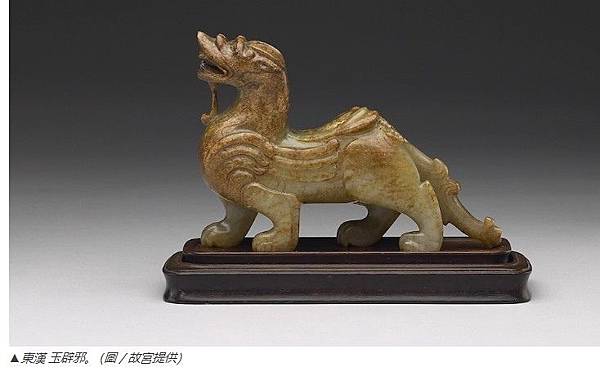 《玉辟邪》東漢,高9.3 公分,長13.6 公分 辟邪,是想像中的神話動物,顧名思義,是人們希望藉助它的法力,來避除邪惡。流行於漢代的辟邪,多為帶翼的四足獸,其造形可能傳自西亞。常以巨石雕刻,立於陵墓前。也用美玉琢成,作為極高貴的陳設器。這件玉辟邪以青白玉琢成,昂首張口,似在低吼。跨步遊走,雙翼雖貼於身側,卻做蓄勢待發狀。頜骨下長髯垂胸,長尾曳地,器宇非凡。因曾經深沁熟盤,甚至再被染色,所以表面多有深淺褐斑。這是目前所知的漢代玉辟邪中,體積較大的一件。它的口吻較長,有似馬臉,與常見的短口吻似虎臉的辟邪不相類似。卻與近年在內蒙古出土的西漢中、晚期銅灶上所加飾的動物頭像,頗為神似。學者多稱銅灶上的動物為「龍頭」。故宮的這件玉辟邪,曾為帝王重要的收藏。辟邪的胸前刻有御製詩。宮中還配有雙層紫檀木座,上層刻有「乾隆禦玩」,下層刻有與辟邪胸前相同的御制詞,刻字的部分還嵌入有銀絲。 https://is.gd/e6xOEH