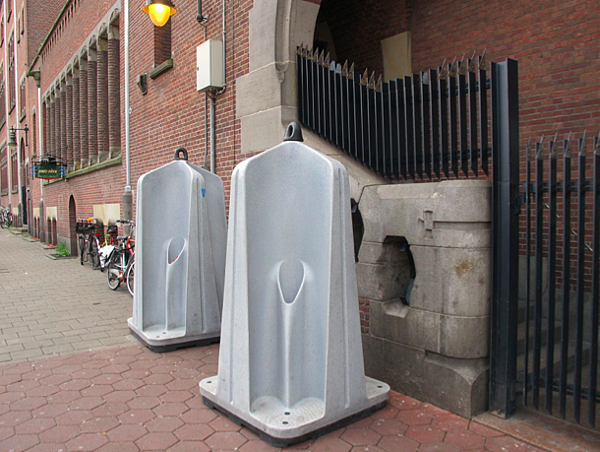 可想見,對於這隨處解放的可怕習慣荷蘭政府是頭痛不已,再度發揮「順勢而為」的創新務實思維,設計了男性公共小便台。連遮蔽也免了的四個洞塑膠製品,通常在離酒吧不遠的廣場隨處可見,若是碰到城市慶典更是街角巷口各點至放一尊。每次看見這些公共小便桶,彷彿都能聽見苦苦哀求之音說著:「如果真要省錢或忍不住找不到廁所,那就拜託尿在這吧。」