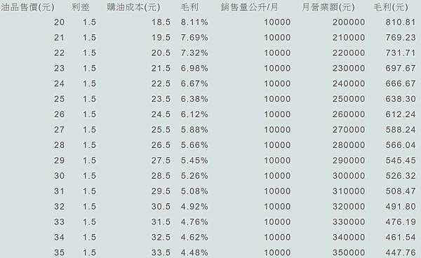 上面的表格,假設一家加油站不管油品售價高低,固定銷售 10000公升/月的油量,中油給這家加油站利差約1.5元/公升,隨著油價的上漲,在固定利差之下,加油站的營業額是上升,但加油站的毛利率是逐漸下滑,可是政府的課稅依據是按名目的營業額扣稅,因此售價越高政府稅收是越多。