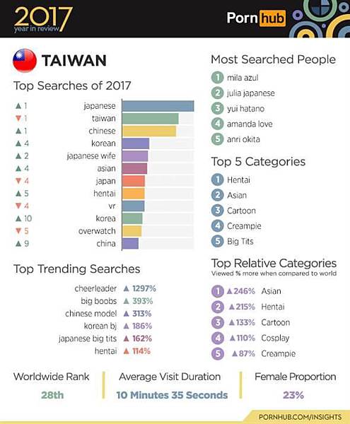 據美國《新聞週刊》(Newsweek)報導,知名情色網站Pornhub整理全球用戶大數據,於日前公佈2017年最新的調查報告,藉此分析不同地區、不同國家、不同年齡與不同性別之間,對於情色影音的喜好差異。在國家/地區的「平均觀賞時間」調查中,台灣雖未進入前20名中,但相較前年同期排名,卻大幅成長了88個名次,造訪網站時間達10分35秒。但其中更讓人感到好奇的,搜尋詞彙中成長幅度最前三名竟然是「啦啦隊」(Cheerleader)、大胸部和大陸模特;而年度搜尋人物冠軍也讓人意外,竟是由來自烏克蘭的裸體模特兒Mila Azul奪得。