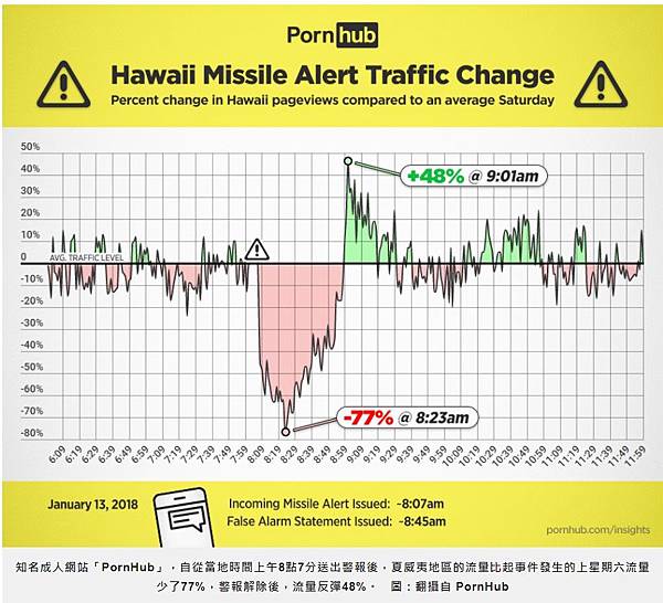 而除了這幾起事件以外,更有趣的是知名成人網站「PornHub」,自從當地時間上午8點7分送出警報後,夏威夷地區的流量比起事件發生的上星期六流量少了77%,等到半小時之後,管理局宣布這是假警報、沒有任何飛彈被發射,夏威夷地區的流量瞬間飆升48%,可見許多人面對恐慌之後,會選擇看A片壓壓驚,而這樣的有趣的數據,也展現了這起事件的另一個側面。
