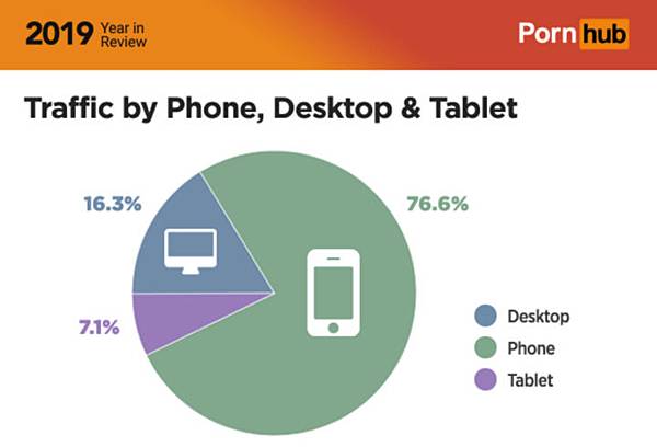 與 2018 年相比,透過 iOS 裝置上 PornHub 的人更多,流量增長 19%,占 PornHub 行動端流量 52.8%,Android 用戶則以 46.6% 拿下另外半壁江山。