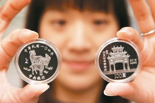 羊年套幣 牌坊上鏡 中央銀行上午展示「乙未年羊年生肖套幣」,其中銀幣正面為三羊圖案,象徵「三陽開泰」,背面則是金門縣的「邱良功母節孝坊」,是國內最大也是保存最完整的牌坊,將於下周四在台銀公開發售,售價新台幣1600元。記者鄭超文/攝影