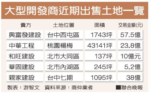 最不尋常的是,過去幾個月,包括興富發、華固、中華工程、和旺以及台中親家建設都出售庫存土地;其中,除了中工出售的四萬多坪土地位於桃園楊梅,位置較偏之外,其他都在精華區,合計出售總金額多達134.5億元。