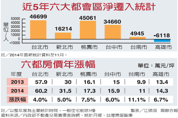 台南、高雄近年房價漲幅頗高,但人口仍呈外流跡象,台灣房屋智庫研究員洪佩君分析,高雄近年來也有不少重大公共建設與轉型機會,如亞洲新灣區、輕軌捷運等,不過也因為企業尚未全面進駐,就業機會仍不如北台灣,導致人口持續外流,但待公共建設到位後,人口回流機會大增,發展潛力佳。
