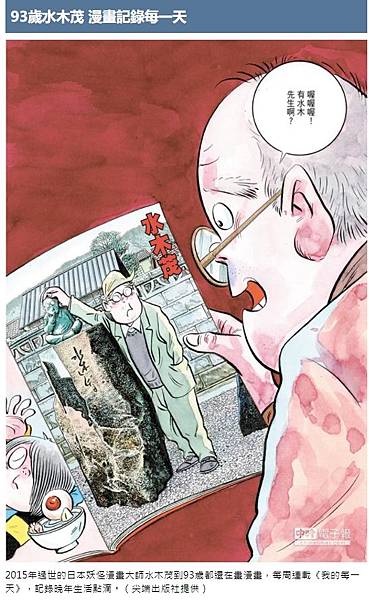 2015年過世的日本妖怪漫畫大師水木茂到93歲都還在畫漫畫,每周連載《我的每一天》,記錄晚年生活點滴。(尖端出版社提供)