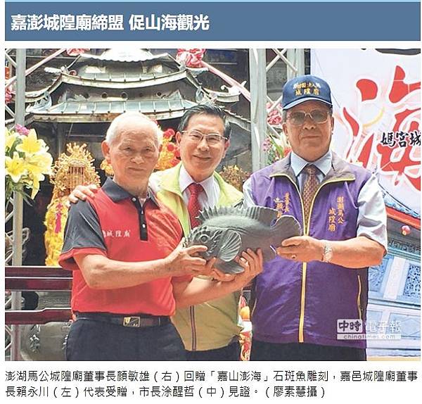 嘉邑城隍廟董事長賴永川致贈檜木製「賞罰分明」算盤,馬公城隍廟董事長顏敏雄回贈以玄武岩製作的「嘉山澎海」石斑魚造型雕刻,市長涂醒哲、行政院雲嘉南區聯合服務中心副執行長徐文志、陳志賢等官員見證。