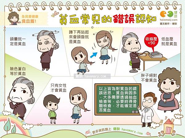 以上皆為對貧血的錯誤迷思,貧血病因多,大多需要透過抽血檢查等,必要時得骨髓檢查,才能確定是否貧血。
