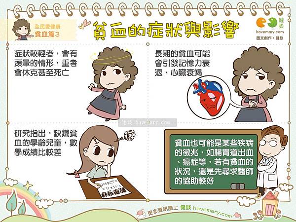 長期的貧血可能會引發記憶力衰退、心臟衰竭。