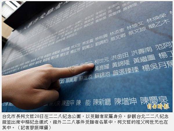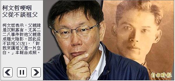 柯文哲昨晚說,台灣光復後,他祖父相信的一切全完蛋,只剩兩條路:自我侮辱活下去或對時局不滿批評,結果他爺爺因選了後者,在二二八事件受害。他不懂,為何他祖父出生在日治時期,他就被稱為官二代。