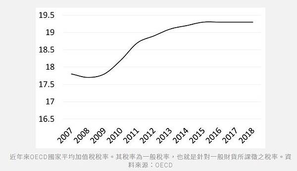 近年來OECD國家平均加值稅稅率。其稅率為一般稅率,也就是針對一般財貨所課徵之稅率。資料來源:OECD