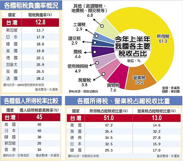 今年上半年我國各主要稅收占比 各國租稅負擔率概況 各國個人所得稅率比較 各國所得稅、營業稅占總稅收比重 所得稅好重 台稅負嚴重扭曲 - 財經要聞 - 工商時報