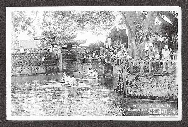 日治時期,板橋林家花園與霧峰林家花園、鹿港辜家花園並稱為台灣三大林園宅第,尤其是林本源庭園最為突出。不少台灣重要人士、來台視察的日本國內官員均獲邀參觀該庭園。1927年,林家花園首次免費公開,遊客向林家申請後,可憑入場券免費參觀。1935年日本人為了慶祝「始政四十年台灣博覽會」,以林本源庭園作為鄉土館開放給民眾免費參觀,在園內陳列台灣歷史的考古文物,並另設咖啡室,室內有板橋美女服務。圖片為1935年開放時的情景。大池中有人泛舟,池畔有假山及曲折小徑,擠滿許多遊客。(1935年,板橋光畫寫真館發行)