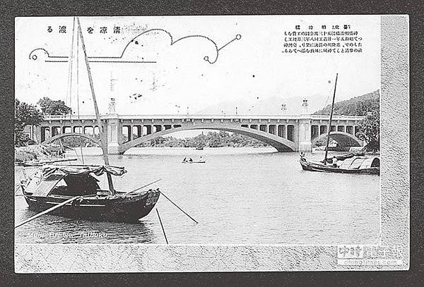 明治橋即台北市中山橋之前身。日治時期,明治橋與台灣神社連成一體,係當時日本人參拜台灣神社必經之道,與「台北橋」並稱為台北兩大橋。該橋歷經兩次修建,最初興築於1901年,鐵製桁架橋,橋面為木造;1912年橋面改為鋼筋混凝土;1933年重建為混凝土拱橋;戰後改名為「中山橋」,2002年為了整頓基隆河而被拆除。本圖為1933年重建之明治橋,全長120公尺,中央為車道,兩側為步道,以花崗岩砌成欄柱,橋上裝置青銅製點燈器的裝飾燈座,技術精妙,結構壯麗。(1930年代發行)