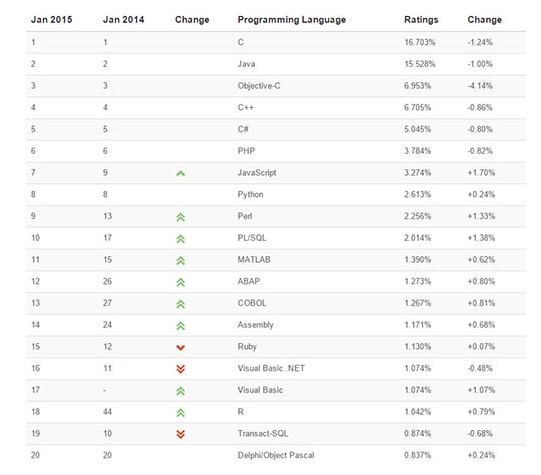 ▲截至 2015 年 1 月為止,前 20 名程式語言的排名相關數據。(圖片來源:TIOBE)